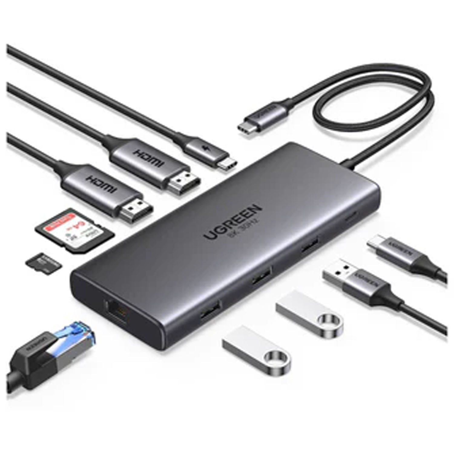 UGREEN 10-IN-1 USB-C MULTIFUNCTION ADAPTER USB-C to 1*USB3.0+2*USB2.0+USB-C3.0+2*HDMI+RJ45 Gigabit+SD&TF +PD | CM639 15534