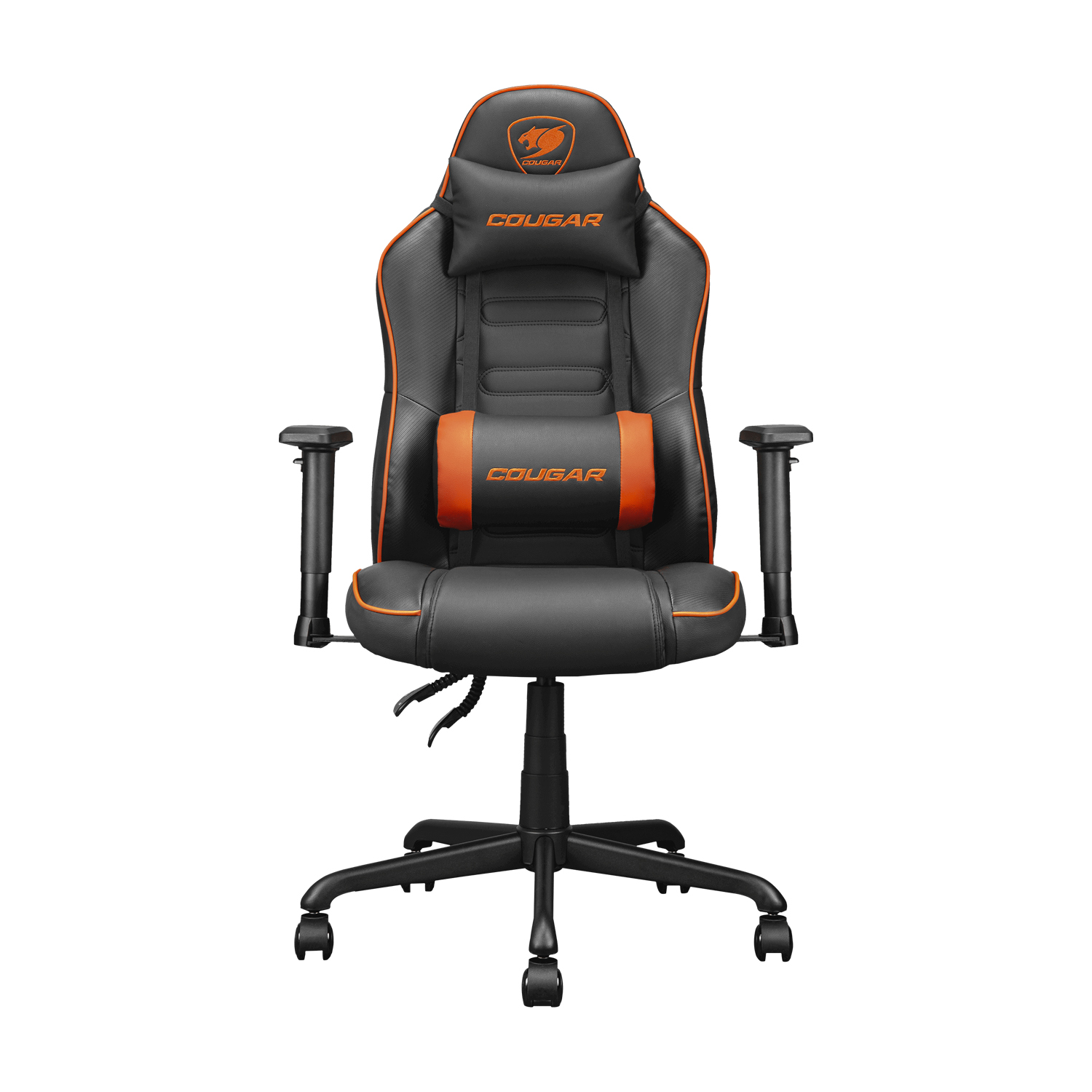 COUGAR FUSION S GAMING CHAIR – BLACK/ORANGE | 2D-ARMREST | 130-RECLINED | METAL BASE | HEIGHT ADJUSTMENT | WITH NECK & LUMBAR PILLOW | SKU: CHR-CGR-FUSION-S-BK/O
